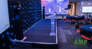 The Aston Media stages are Heavy Duty Stage Panels – 2m x 1m with 400mm legs and 300mm legs. All stages can be carpeted to match your brand and include all fixings. Our team will deliver and install the stage to your venue.